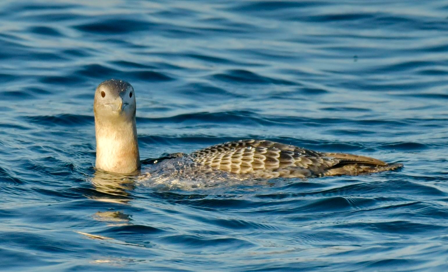 Părțile superioare sunt negricioase, fiecare pană cu o pată albă mică, pe penele scapulare aceste pete formează rânduri mari de pătrate predominant albe; tectricele supraalare negricioase pătate cu alb, partea inferioară a aripii mai palidă; coada negricioasă. Partea inferioară a gâtului are linii longitudinale negre și albe, cele albe formează rânduri de pete mici pe laturi, porțiunea inferioară centrală a părții anterioare a gâtului și toată partea inferioară pur albe, cu excepția unui negru pe tectricele subcodale. Ciocul lung este galben deschis sau albicios de culoarea fildeșului; unghiul gonidial al ciocului (unghiul bărbiei) este pronunțat, maxila adesea dreaptă, prin urmare ciocul pare într-o oarecare măsură curbat în sus; când înoată, ține ciocul îndreptat în sus și această curbură se accentuează. Picioarele sunt cenușiu-brunii, cenușiu deschis pe jumătatea interioară. Irisul este roșu.