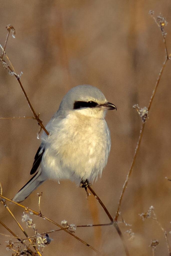 Penajul (fără negru pe frunte) este asemănător cu cel al sfrânciocului mic, dar pieptul este albicios. Cuibăreşte în arbori, dar la înălţime.