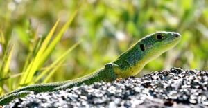 The European Green Lizard (Lacerta viridis) is a large lizard distributed across European midlatitudes from Slovenia and eastern Austria to as far east as the Black Sea coasts of Ukraine and Turkey. It is often seen sunning on rocks or lawns, or sheltering amongst bushes.
