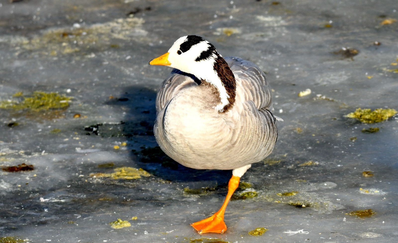 The bar-headed goose migrates over the Himalayas to spend the winter in parts of South Asia (from Assam to as far south as Tamil Nadu.The modern winter habitat of the species is cultivated fields, where it feeds on barley, rice and wheat, and may damage crops. Birds from Kyrgyzstan have been seen to stopover in western Tibet and southern Tajikistan for 20 to 30 days before migrating farther south. Some birds may show high wintering site fidelity.