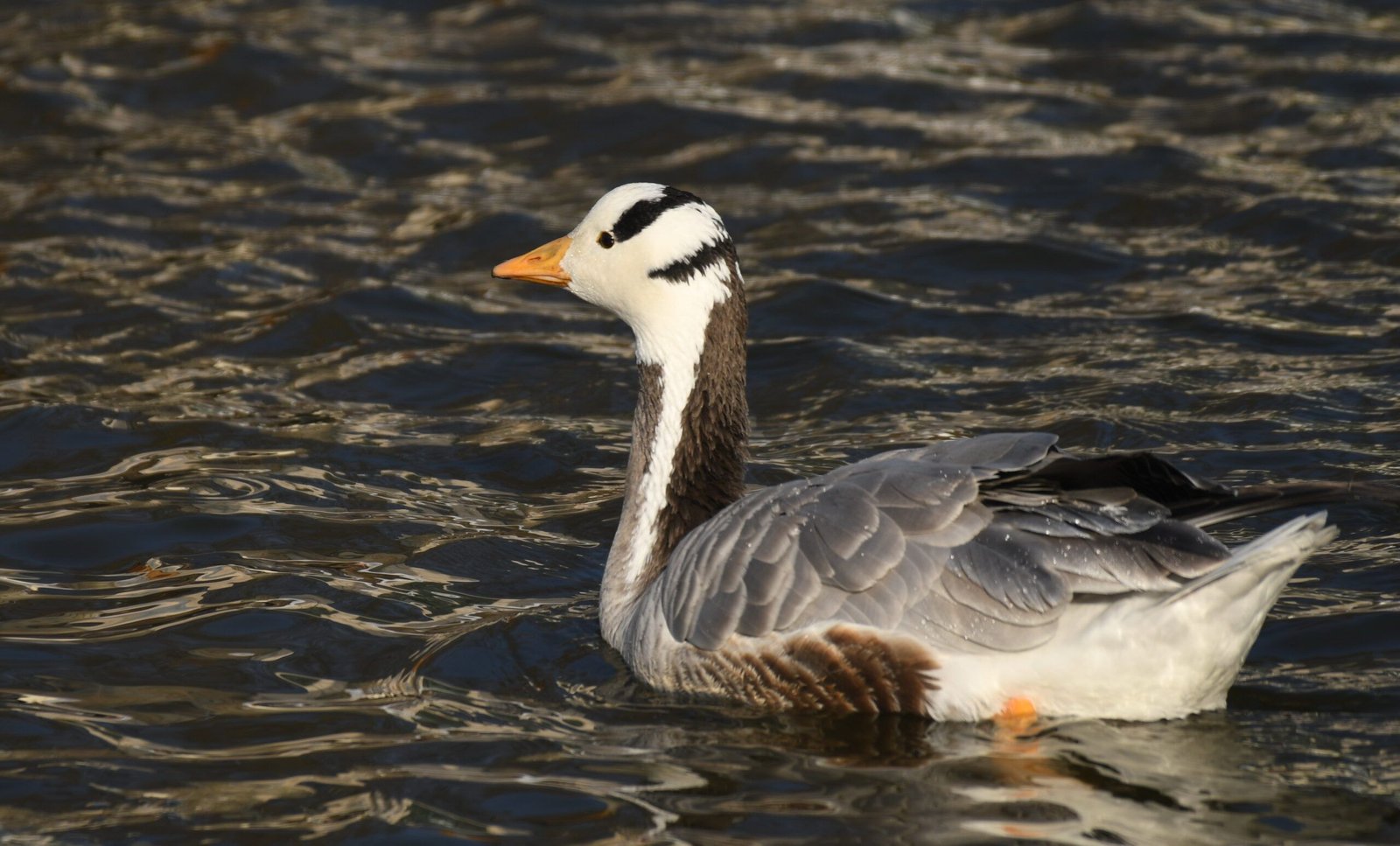 The bar-headed goose (Anser indicus) is a goose that breeds in Central Asia in colonies of thousands near mountain lakes and winters in South Asia, as far south as peninsular India. It lays three to eight eggs at a time in a ground nest. It is known for the extreme altitudes it reaches when migrating across the Himalayas.