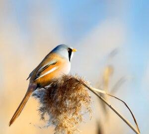 This is a small orange-brown bird with a long tail and an undulating flight. The male has a grey head and black moustaches (not a beard). Flocks often betray their presence in a reedbed by their characteristic “ping” call.