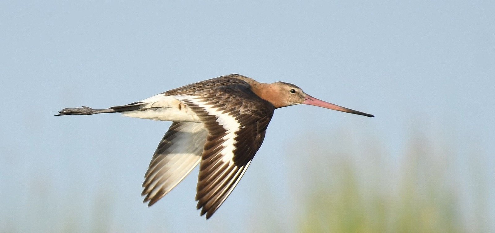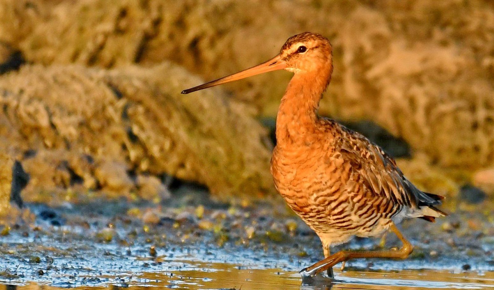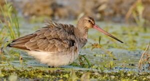 The Black-tailed Godwit is a large wader with long bill (7.5 to 12 cm long), neck and legs. During the breeding season, the bill has a yellowish or orange-pink base and dark tip; the base is pink in winter. The legs are dark grey, brown or black. The sexes are similar,but in breeding plumage, they can be separated by the male’s brighter, more extensive orange breast, neck and head. In winter, adult Black-tailed Godwits have a uniform brown-grey breast and upperparts (in contrast to the Bar-tailed Godwit’s streaked back). Juveniles have a pale orange wash to the neck and breast.