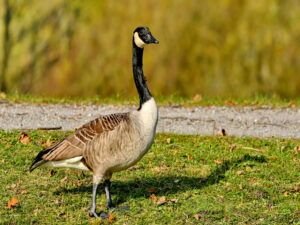 The black head and neck with a white “chinstrap” distinguish the Canada goose from all other goose species, with the exception of the cackling goose and barnacle goose (the latter, however, has a black breast and gray rather than brownish body plumage).