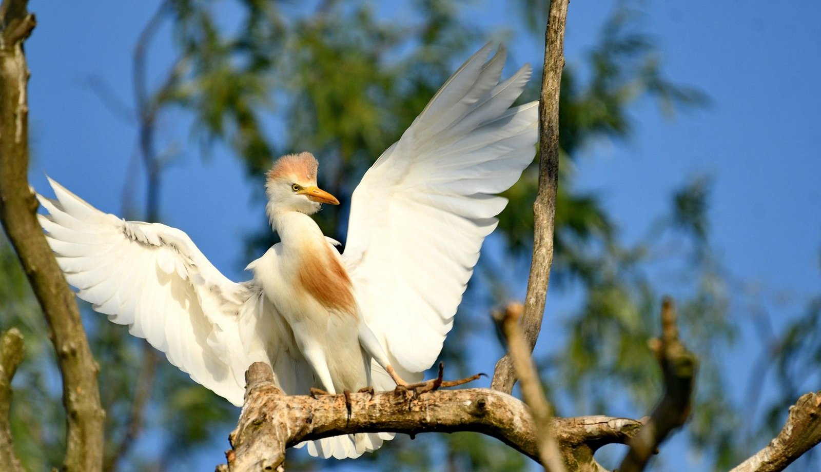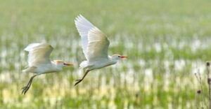 It is a white bird adorned with buff plumes in the breeding season. It nests in colonies, usually near bodies of water and often with other wading birds. The nest is a platform of sticks in trees or shrubs. Cattle Egrets exploit drier and open habitats more than other heron species. Their feeding habitats include seasonally inundated grasslands, pastures, farmlands, wetlands and rice paddies. They often accompany cattle or other large mammals, catching insect and small vertebrate prey disturbed by these animals. Some populations of the Cattle Egret are migratory and others show post-breeding dispersal.