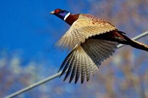 While Common Pheasants are able short-distance fliers, they prefer to run. If startled however, they can suddenly burst upwards at great speed, with a distinctive “whirring” wing sound and often giving kok kok kok calls to alert conspecifics. Their flight speed is only 43–61 km/h (27–38 mph) when cruising but when chased they can fly up to 90 km/h (56 mph).