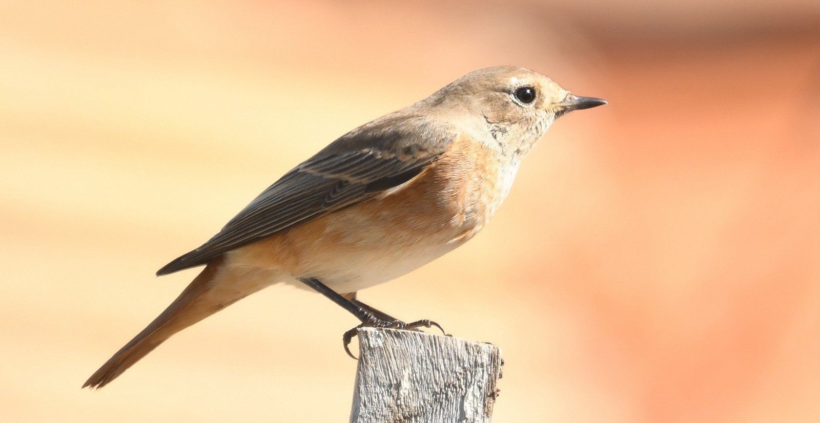 The Common Redstart shows some affinity to the European Robin in many of its habits and actions. It has the same general carriage, and chat-like behaviour, and is the same length at 13–14.5 cm long but slightly slimmer and not quite as heavy, weighing 11–23 g. The orange-red tail, from which it and other redstarts get their names (“start” is an old word for “tail”), is frequently quivered. Among common European birds, only the Black Redstart (Phoenicurus ochrurus) has a similarly coloured tail.