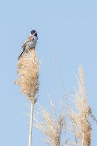 The Common Reed Bunting is a medium sized bird, 13.5-15.5 cm long, with a small but sturdy seed-eater’s bill. The male has a black head and throat, white neck collar and underparts, and a heavily streaked brown back. The female is much duller, with a streaked brown head, and is more streaked below.