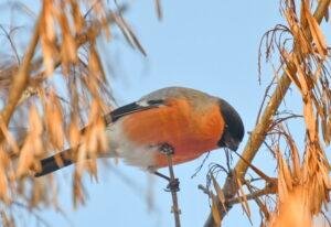The Bullfinch is a bulky bull-headed bird. The upper parts are grey; the flight feathers and short thick bill are black; as are the cap and face in adults (they are greyish-brown in juveniles), and the white rump and wing bars are striking in flight. The adult male has red underparts, but females and young birds have grey-buff underparts. The pleasant song of this unobtrusive bird contains fluted whistles.