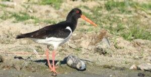 The Oystercatcher is one of the largest waders in the region. It is 40–45 centimetres (16–18 in) long (bill 8–9 cm) with a wing-span 80–85 centimetres (31–33 in). They are obvious and noisy plover-like birds, with black and white plumage, red legs and strong broad red bills used for smashing or prising open molluscs such as mussels or for finding earthworms. Despite its name, oysters do not form a large part of its diet. The bird still lives up to its name, as few if any other wading birds are capable of opening oysters at all.