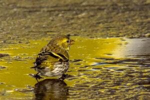 They are very active and restless birds. They are also very social, forming small cohesive flocks especially in autumn and winter. They are fairly trusting of humans, it being possible to observe them from a short distance. During the breeding season, however, they are much more timid, solitary and difficult to observe. For this reason there is a German legend which says that Siskins guard a magic stone in their nests that makes them invisible. It is one of the few species which has been described as exhibiting “allofeeding”‘ behavior, this is where subordinates (of the same sex) regurgitate food for the dominant members of the group, which creates a strong cohesion in the flocks and implies a hierarchical structure within the group.