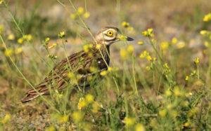 The genus name Burhinus comes from the Greek bous, ox, and rhis, nose. The species name oedicnemus comes from the Greek oidio, to swell, and kneme, the shin or leg, referring to the bird’s prominent tibiotarsal joints which also give it the common name of “thick-knee”. This is an abbreviated form of Pennant’s 1776 coinage “thick kneed bustard”.