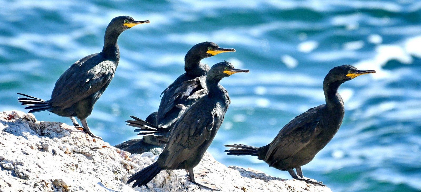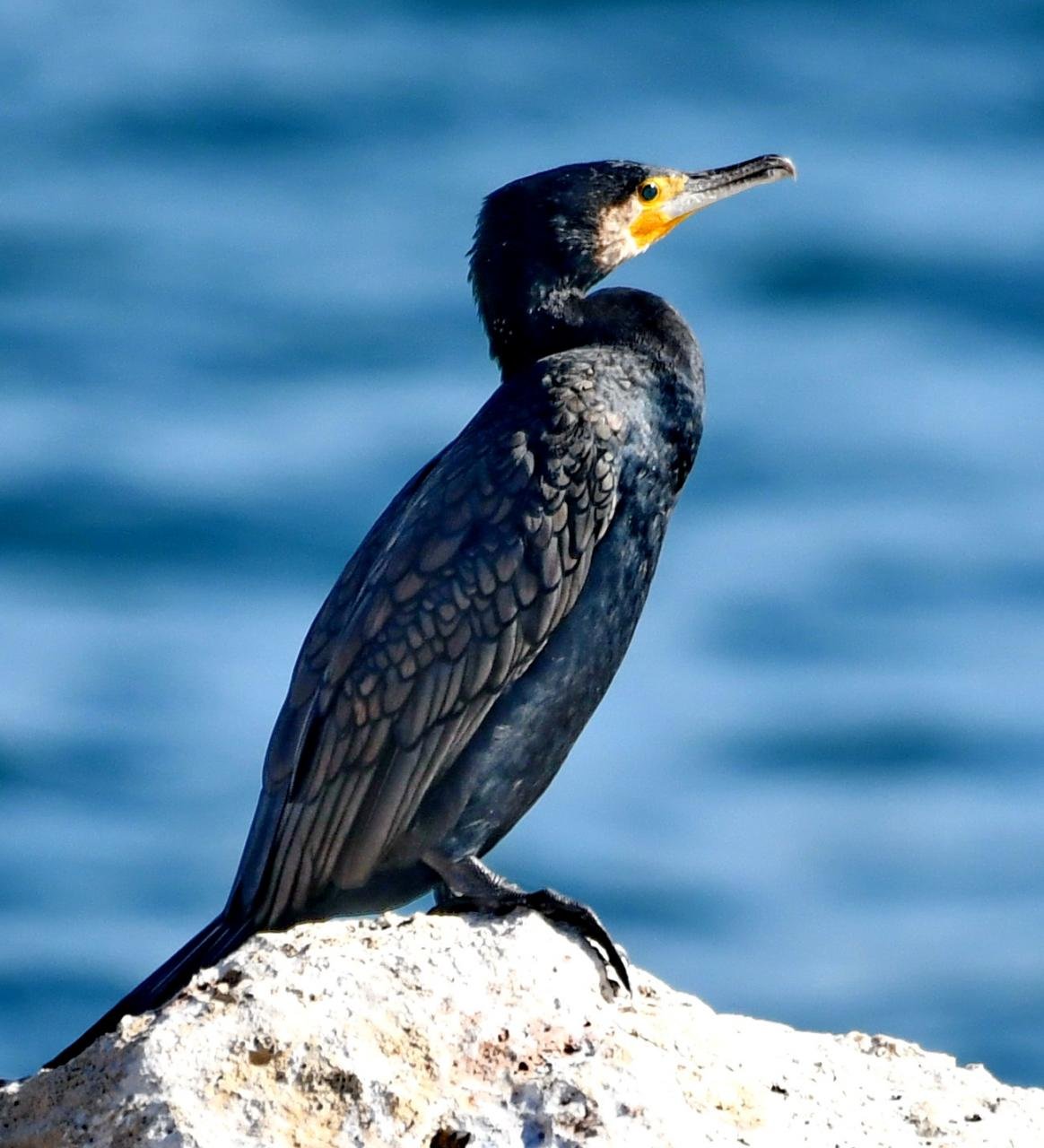 This is a medium-large black bird, 68 to 78 cm (27 to 31 in) long and with a 95-to-110-centimetre (37 to 43 in) wingspan. It has a longish tail and yellow throat-patch. Adults have a small crest in the breeding season. It is distinguished from the great cormorant by its smaller size, lighter build, thinner bill, and, in breeding adults, by the crest and metallic green-tinged sheen on the feathers. Among those differences are that a shag has a lighter, narrower beak; and the juvenile shag has darker underparts. The European shag’s tail has 12 feathers, the great cormorant’s 14 feathers. The green sheen on the feathers results in the alternative name green cormorant sometimes being given to the European shag.