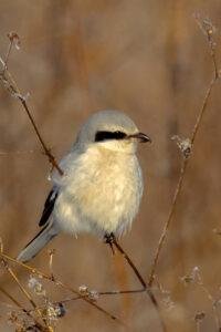 The flight of the Great Grey Shrike is undulating and rather heavy, but its dash is straight and determined. It is, as noted above, also capable of hover flights, which last briefly but may be repeated time after time because of the birds’ considerable stamina. It will usually stay low above the ground in flight, approaching perches from below and landing in an upward swoop. In social interactions, birds signal an aggressive stance by a bold upright posture, fanning and then flicking the tail and eventually the wings also as the bird gets more excited. It signals its readiness to strike at an intruder by shifting to a horizontal pose and fluffing its feathers, raising them into a small crest along the top of the head. Birds appease conspecifics by head-turns away from them (if close by), or by imitating the crouching fluttering pose and calls given by fledglings begging for food (if sitting father apart). The submission gesture to prevent an imminent attack by a conspecific is pointing the beak straight up.