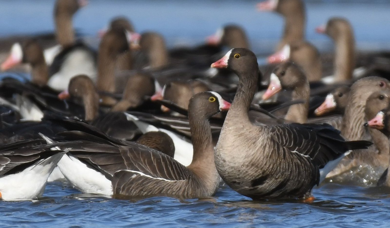 Adult lesser white-fronted geese, as well as being smaller than white-fronted geese, have an obvious yellow eye-ring, and the white facial blaze goes up to the crown.