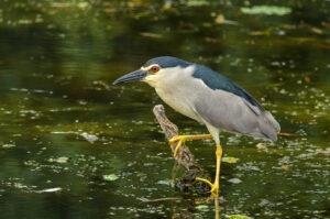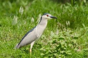 Adults are approximately 64 cm (25 in) long and weigh 800 g (28 oz). They have a black crown and back with the remainder of the body white or grey, red eyes, and short yellow legs. They have pale grey wings and white underparts. Two or three long white plumes, erected in greeting and courtship displays, extend from the back of the head. The sexes are similar in appearance although the males are slightly larger. Black-crowned Night Herons do not fit the typical body form of the heron family. They are relatively stocky and about 25 in tall (63 cm) with shorter bills, legs, and necks than their more familiar cousins the egrets and “day” herons. Their resting posture is normally somewhat hunched but when hunting they extend their necks and look more like other wading birds.