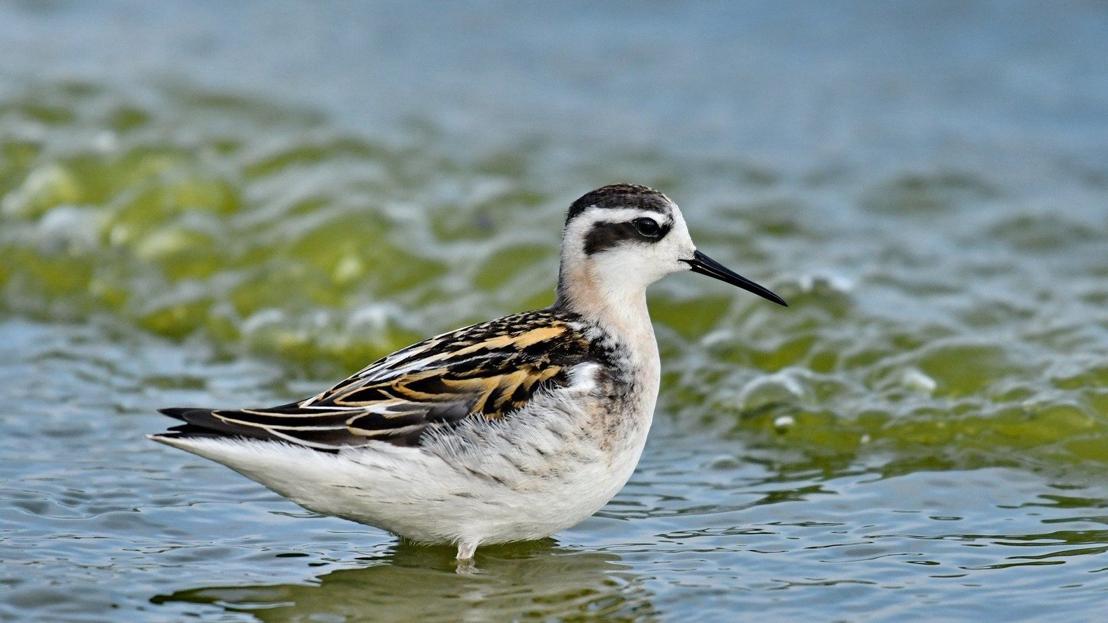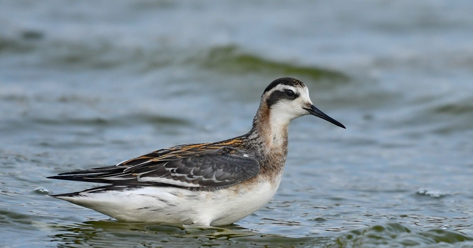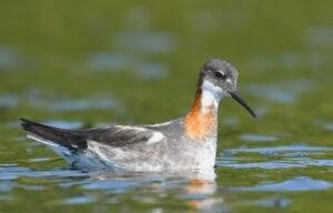 The red-necked phalarope is about 18 cm (7.1 in) in length, with lobed toes and a straight, fine bill. The breeding female is predominantly dark grey above, with a chestnut neck and upper breast, black face and white throat. They have a white wing stripe which helps distinguish this bird from the similar Wilson’s phalarope. The breeding male is a duller version of the female. They have lobed toes to assist with their swimming. Young birds are grey and brown above, with buff underparts and a black patch through the eye. In winter, the plumage is essentially grey above and white below, but the black eyepatch is always present. They have a sharp call described as a whit or twit.