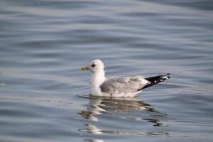 Adult common gulls are 40–46 cm long, noticeably smaller than the herring gull, and slightly smaller than the ring-billed gull, also differing from the later in its shorter, more tapered bill with a more greenish shade of yellow, as well as being unmarked during the breeding season. The body is grey above and white below. The legs are greenish-yellow. In winter, the head is streaked grey, and the bill often has a poorly defined blackish band near the tip (sometimes sufficiently obvious to cause confusion with ring-billed gull). They have black wingtips with large white “mirrors”. Young birds have scaly black-brown upperparts and a neat wing pattern, and grey legs. They take two to three years to reach maturity. The call is a high-pitched “laughing” cry.