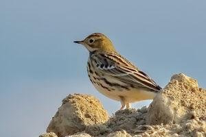This is a small pipit, with adults easily identified in the breeding season by their brick red face and throat. In other plumages this is an undistinguished looking species, heavily streaked brown above, with whitish mantle stripes, and with black markings on a white background below. Its flight is strong and direct, and it gives a characteristic “psii” call.