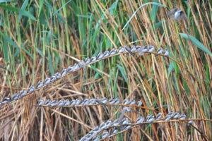 The Sand Martin’s twittering song is continuous when the birds are on the wing, and becomes a conversational undertone after they have settled in the roost. The harsh alarm is heard when a passing falcon, crow or other suspected predator requires combined action to drive it away.