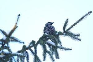 The spotted nutcracker, Eurasian nutcracker, or just nutcracker, (Nucifraga caryocatactes) is a passerine bird slightly larger than the Eurasian jay. It has a much larger bill and a slimmer looking head without any crest. The feathering over its body is predominantly a chocolate brown with distinct white spots and streaks. The wings and upper tail are virtually black with a greenish-blue gloss. It is one of three species of nutcracker. The large-spotted nutcracker (Nucifraga multipunctata), was formerly considered a subspecies of spotted. The other member of the genus, Clark’s nutcracker (Nucifraga columbiana), occurs in western North America.