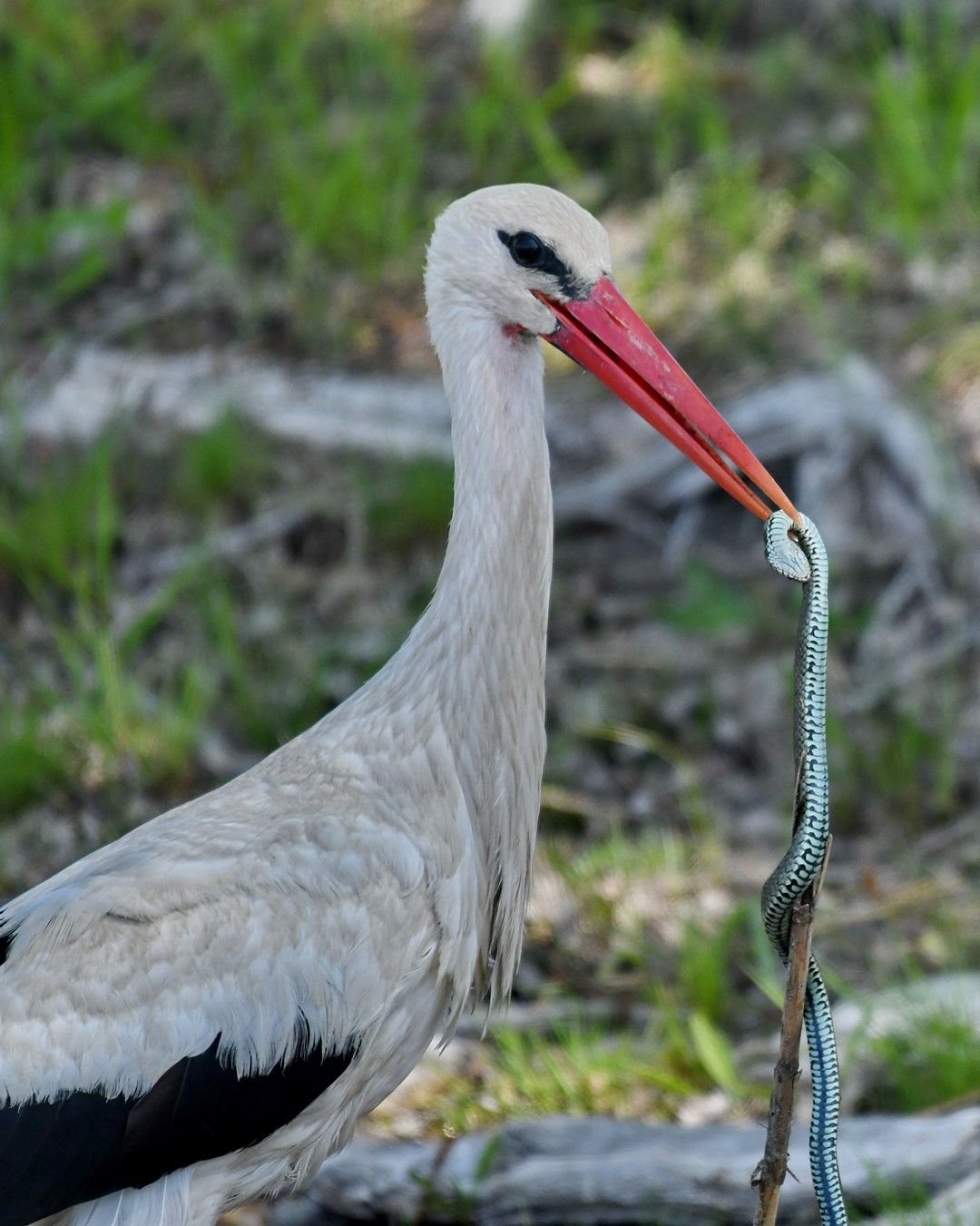 White Storks consume a wide variety of animal prey. They prefer to forage in meadows that are within roughly 5 km (3 mi) of their nest and sites where the vegetation is shorter so that their prey is more accessible.Their diet varies according to season, locality and prey availability. Common food items include insects (primarily beetles, grasshoppers, locusts and crickets), earthworms, reptiles, amphibians, particularly frog species such as the edible frog (Pelophylax kl. esculentus) and common frog (Rana temporaria) and small mammals such as voles, moles and shrews. Less commonly, they also eat bird eggs and young birds, fish, molluscs, crustaceans and scorpions. They hunt mainly during the day, swallowing small prey whole, but killing and breaking apart larger prey before swallowing. Rubber bands are mistaken for earthworms and consumed, occasionally resulting in fatal blockage of the digestive tract.