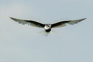 The wings, as the name implies, are mainly white. The inner wing is grayish with brown-tipped coverts. In non-breeding plumage, most of the black is replaced by white or pale grey, though a few blackish feathers may be retained, admixed with white underparts. A good deal of black shows in the underwing-coverts. The head is black, with a white forehead. The crown is blackish-brown, flecked with white, and the hindcrown is blackish with a certain amount of white flecking. These white markings are pronounced in the winter adult. There is a dark triangular patch forward of the eye. The collar is fairly broad and white. In juveniles and moulting adults, the rump is pale gray, becoming grey in both phases late in the year. The clear white collar and rump isolate the mantle as a dark brown ‘saddle’. The mantle feathers have narrow paler brown tips, as have the tertials and scapulars.