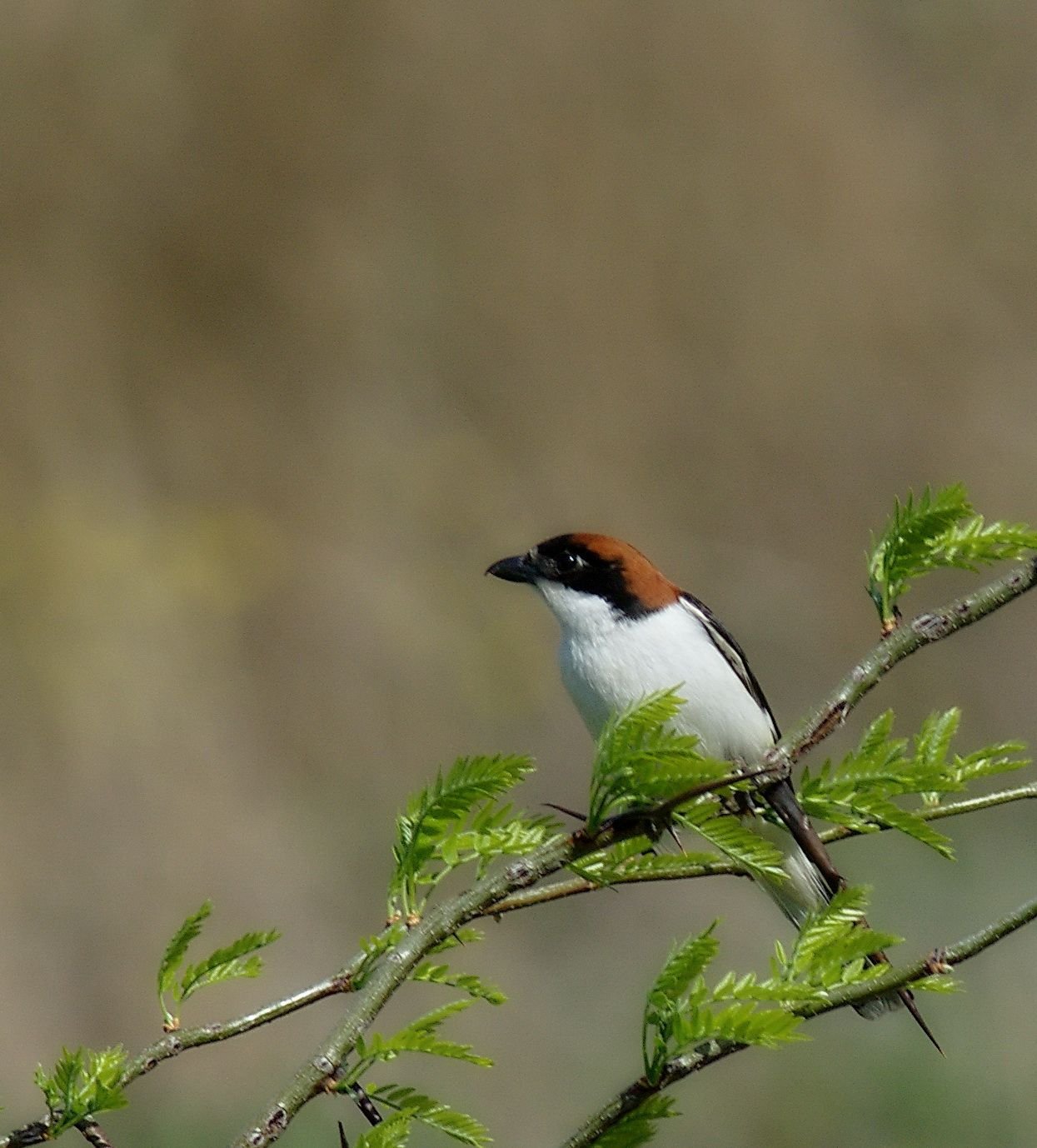 The male is a striking bird with black and white plumage and a chestnut crown. The race L. s. badius of the western Mediterranean lacks the large white wing patches.