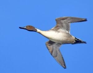 The pintail or northern pintail (Anas acuta) is a duck with wide geographic distribution that breeds in the northern areas of Europe, Asia and North America. It is migratory and winters south of its breeding range to the equator. Unusually for a bird with such a large range, it has no geographical subspecies if the possibly conspecific duck Eaton’s pintail is considered to be a separate species.