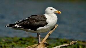 C’est un grand goéland (61 à 74 cm de long pour 1,4 à 1,7 m d’envergure) au dos noir aux pattes couleur chair et au bec massif.